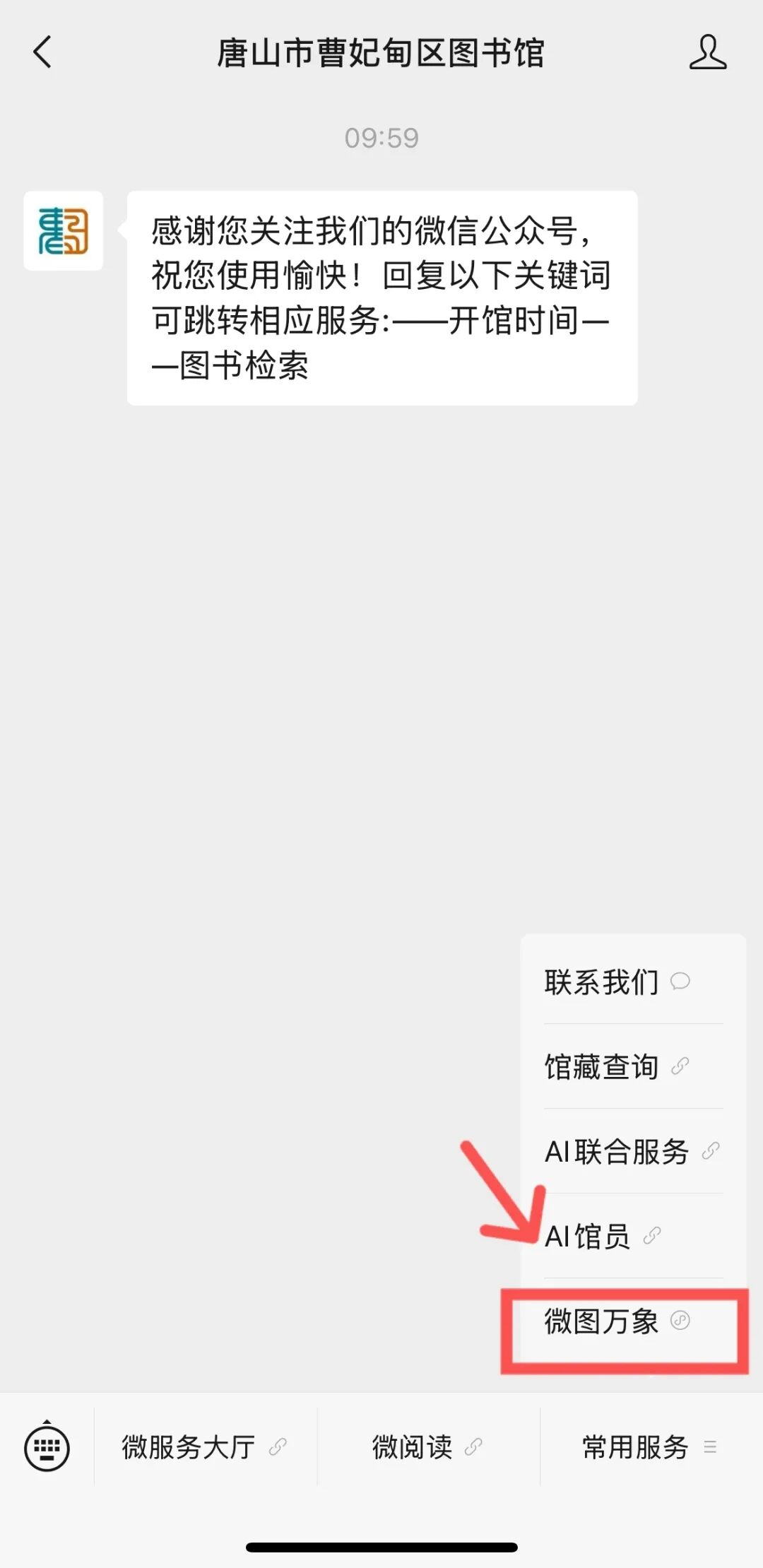 进入“唐山市曹妃甸区图书馆”微信公众号,点击底部菜单“微阅读”--“微图万象”。